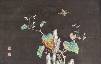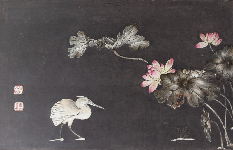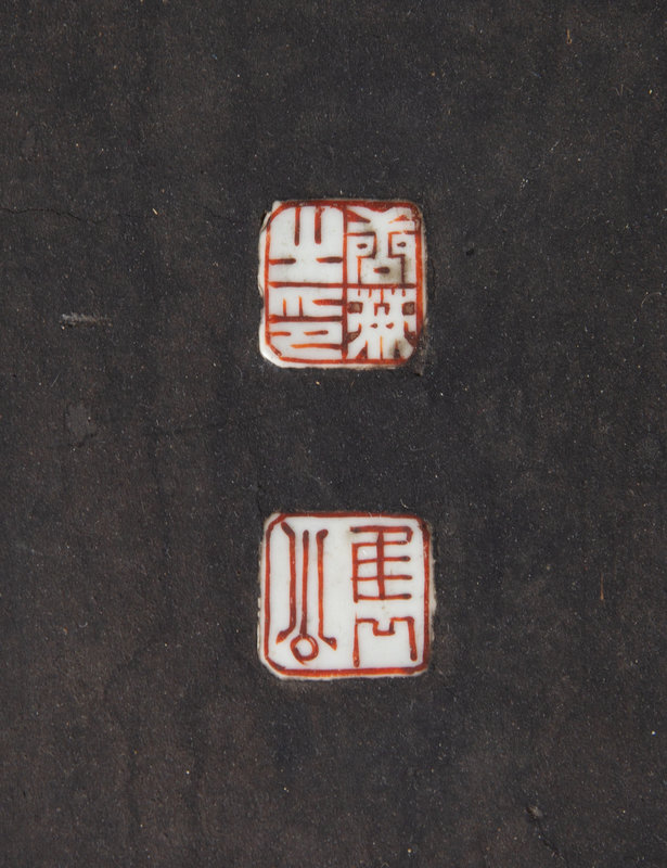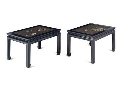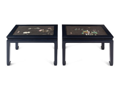 Two Chinese Porcelain-Inset Polychrome Lacquer Panels Mounted as Tables