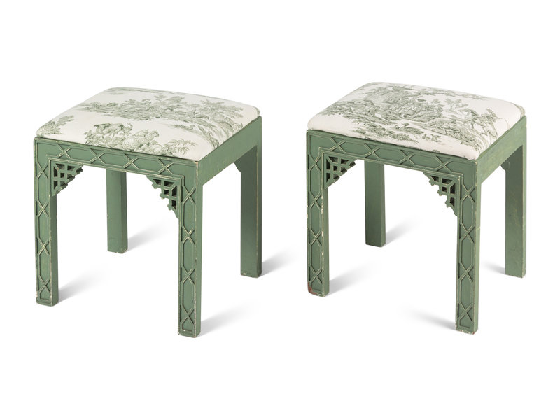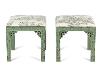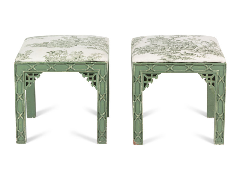 A Pair of Chinese Chippendale Style Green-Painted Stools