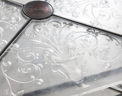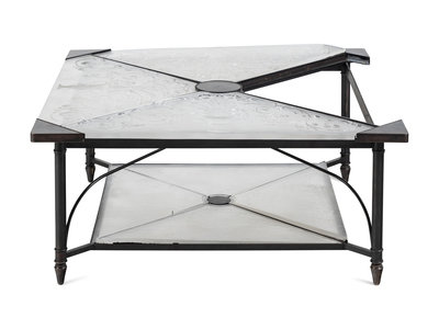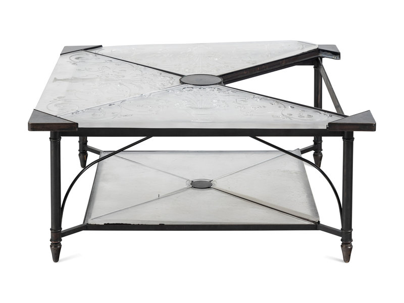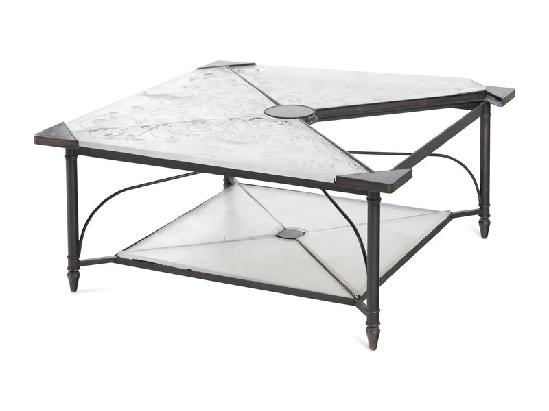 An Etched Glass-Top Patinated Metal Cocktail Table
