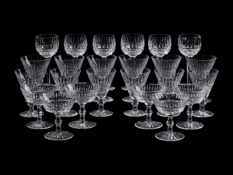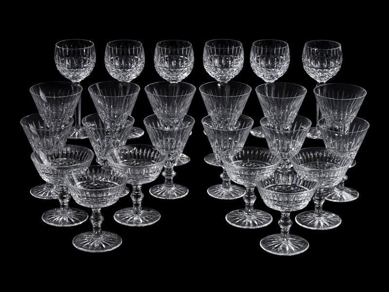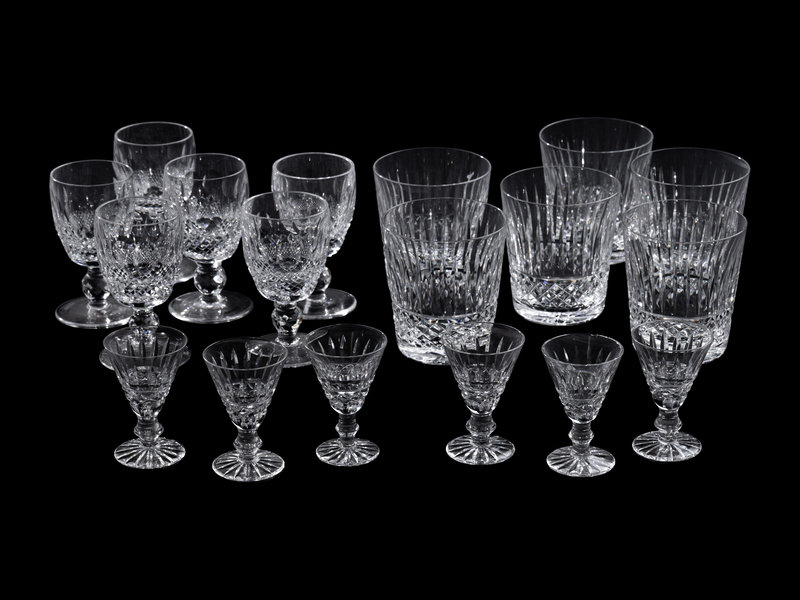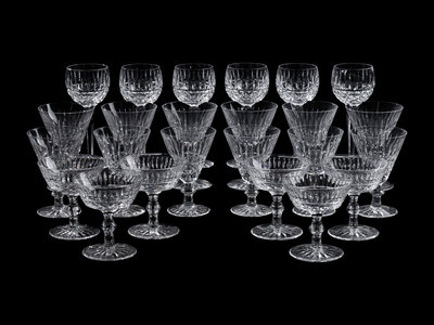 comprising six hock wine glasses, six red wine glasses, six white wine glasses, six coupes, six old fashioned glasses and six cordials, together with six similar Waterford port wine glasses; 42 items total.