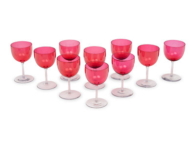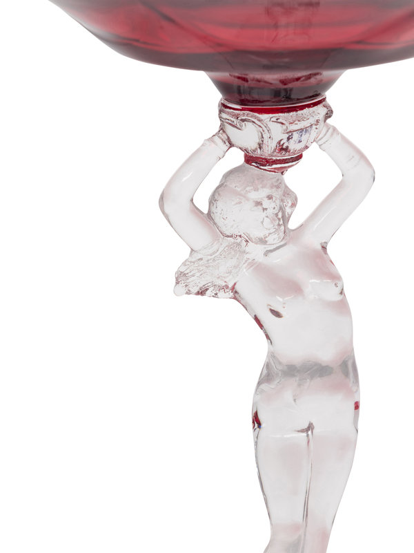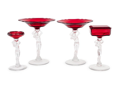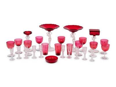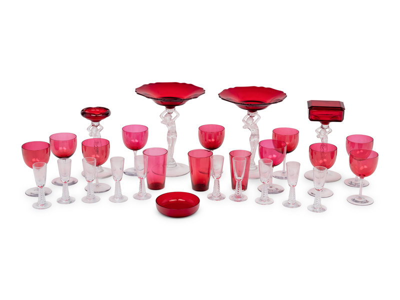 comprising two figural tazze, two candy dishes with figural stems, ten cordials with twisted stems, three tumblers, ten wine glasses and one shallow bowl; 28 items total.