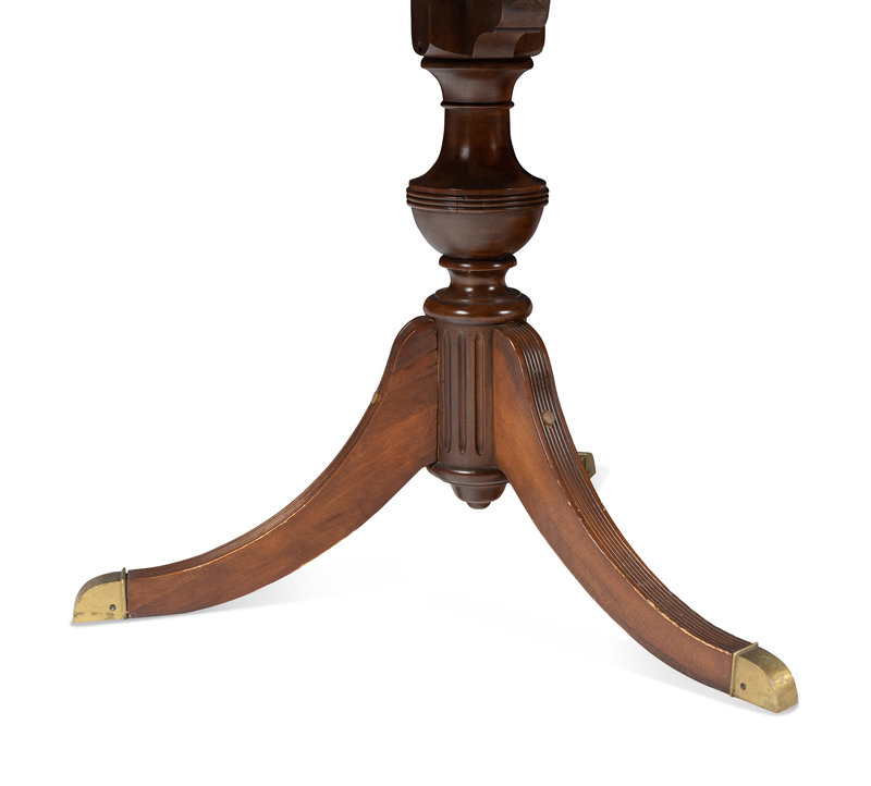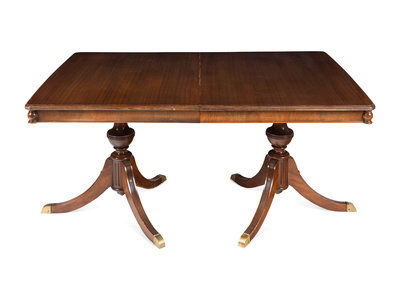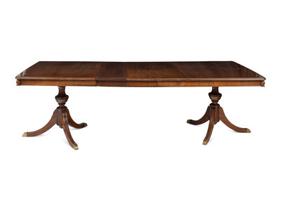 numbered 2767 to the underside along one edge of the tabletop with a latch marked The Seng Co. / Chicago to the underside of the tabletop and one pedestal base marked Berkey & Gay Furniture; with four leaves and a set of fitted table pads.