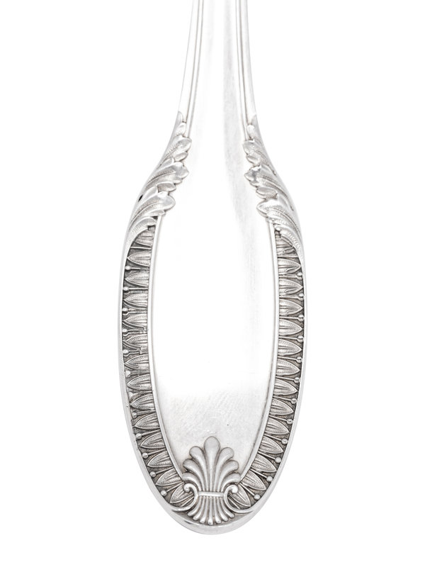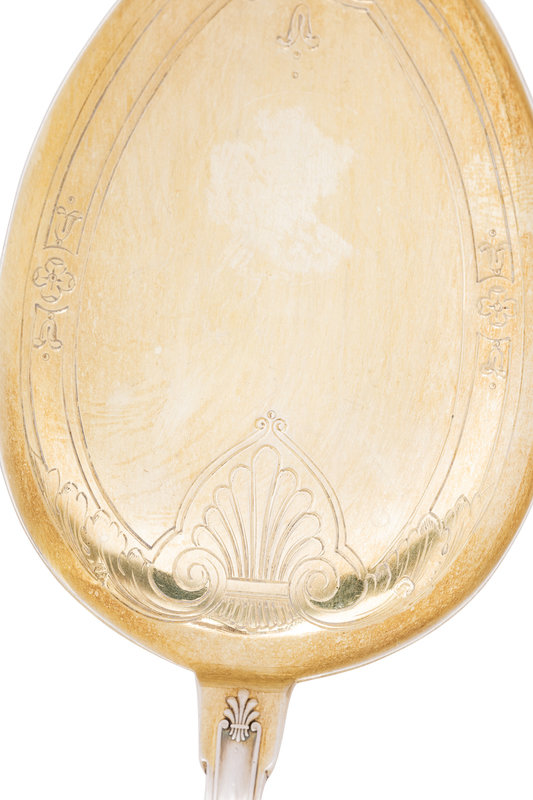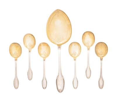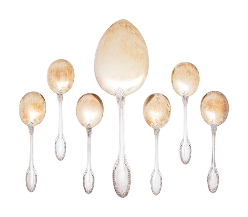 comprising twelve ice cream spoons and a serving spoon, in original case marked for Ch. Bourdet to the underside of the lid.