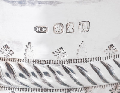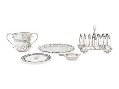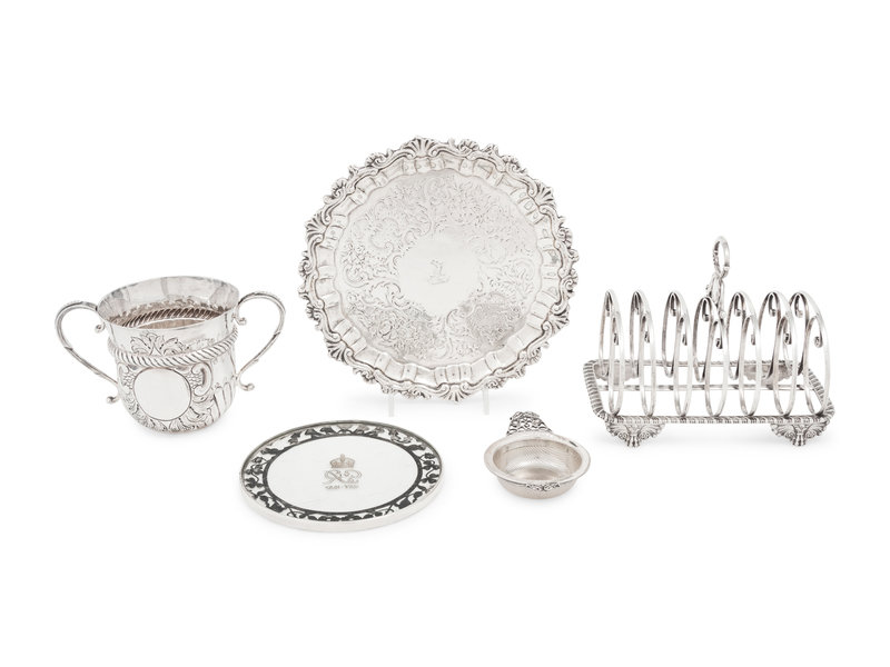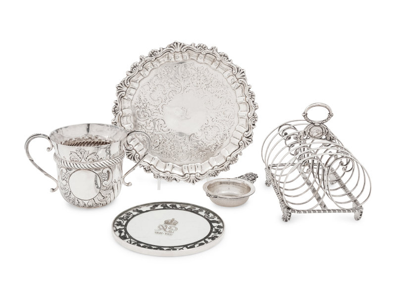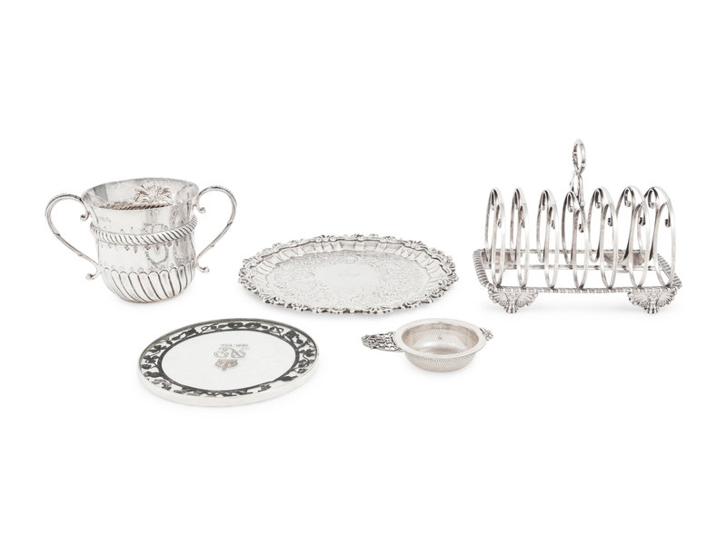 comprising a caudle cup, a toast rack, a tea strainer and bowl, a waiter and a glass-lined trivet.
