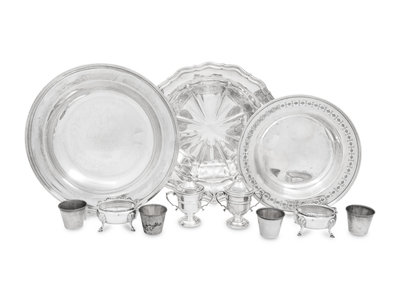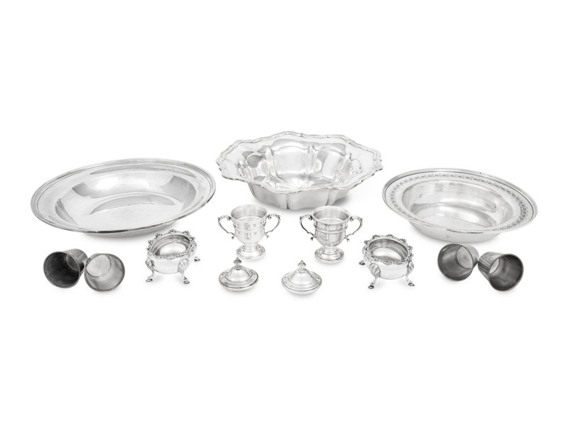 comprising a pair of Tiffany & Co. miniature cup-and-covers, a pair of Gorham salt cellars, four R. Blackinton & Co. shot glasses in leather case and three dishes by various makers, one dish bearing presentation inscription 'MBYC / L.I.S. Fall Series / 1st Overall / I.O.R. / 1986'.