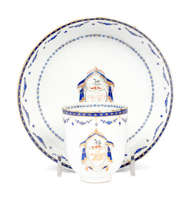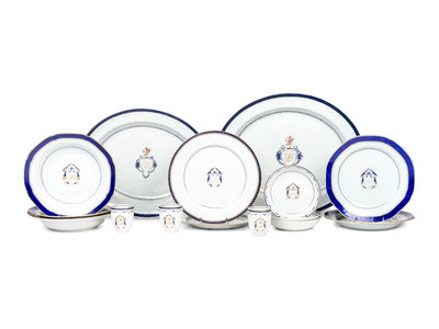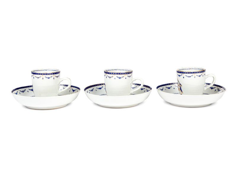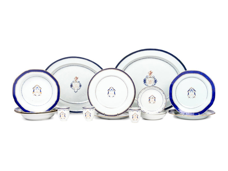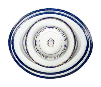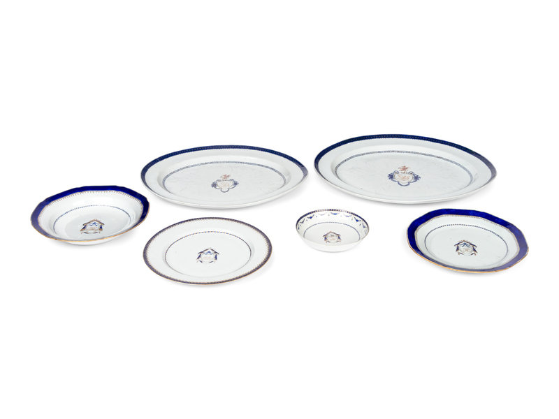 including two similar sets, the first comprising two plates, three soup bowls, one medium platter and one large platter, the second comprising three cups with saucers and two plates, together with two unassociated earthenware platters; 17 items total.