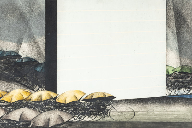 together with one mixed-media collage and one print on canvas, each framed.