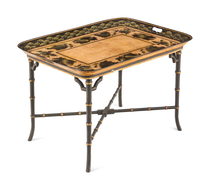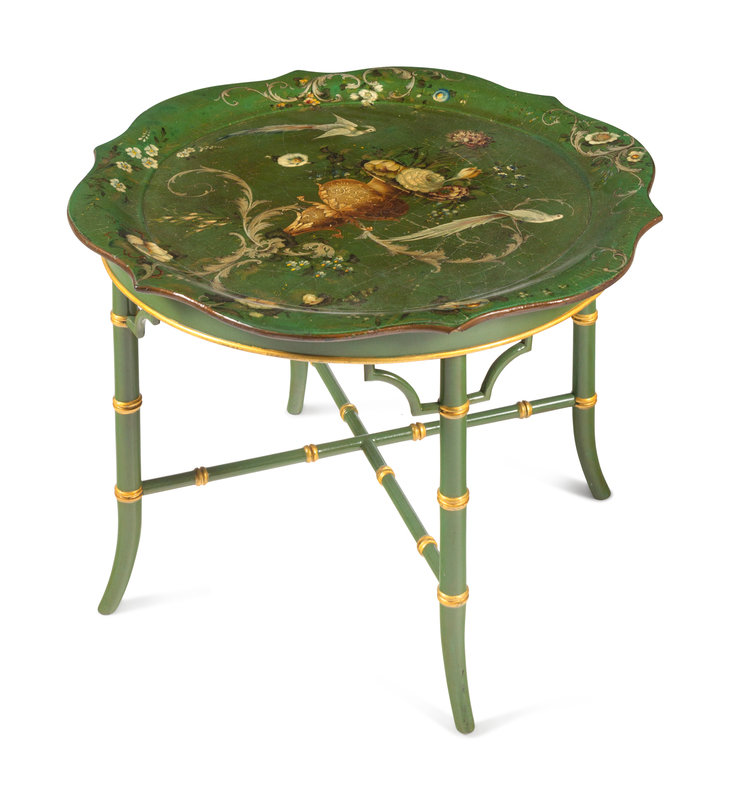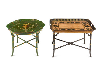 comprising a green early Victorian example on later stand and a black early Regency example on a bamboo-style stand.