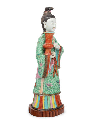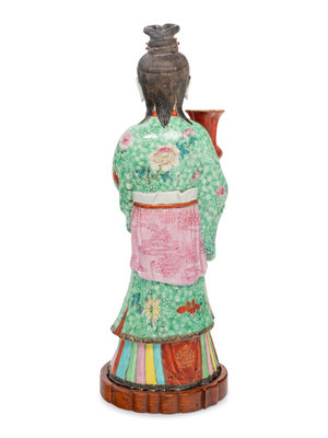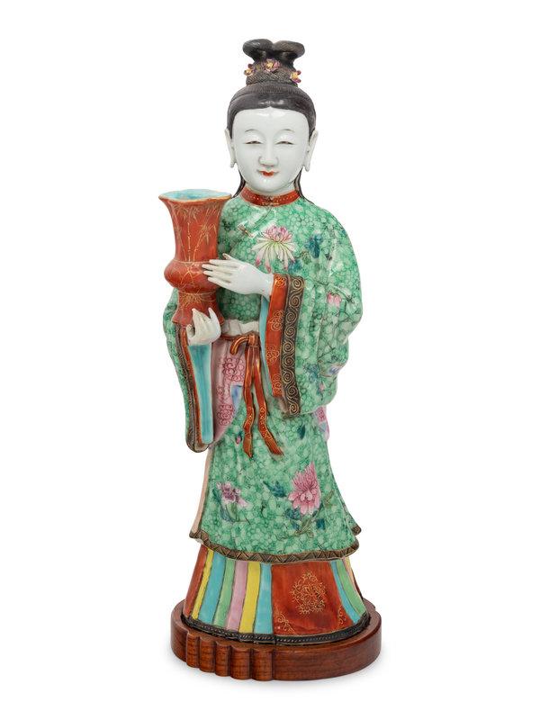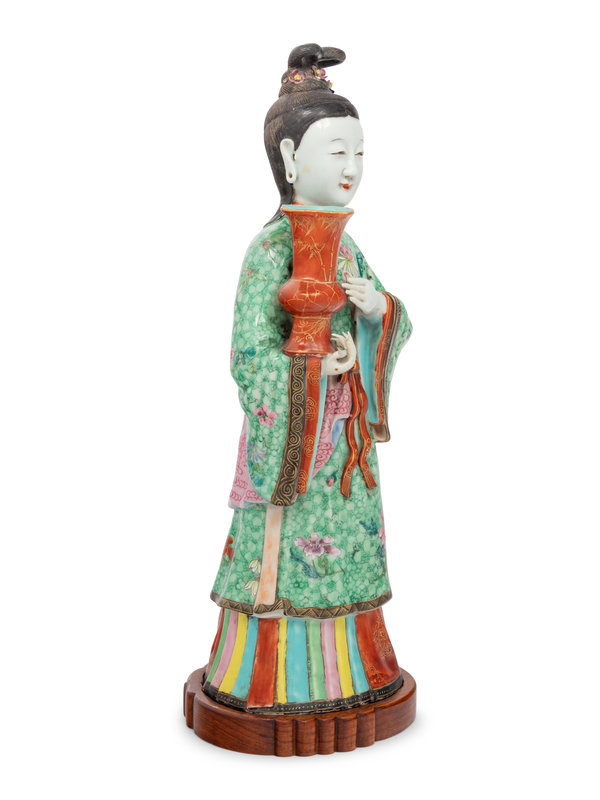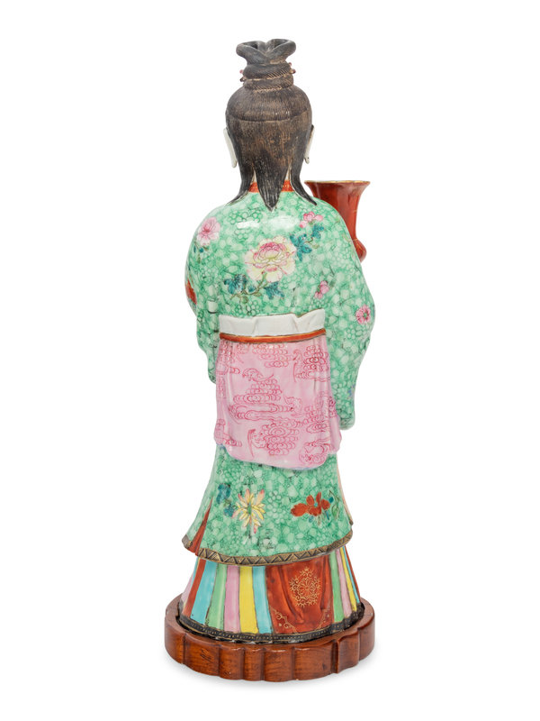 depicted holding a flower vase and wearing robes enameled in famille rose colors, on a fitted wood stand.