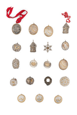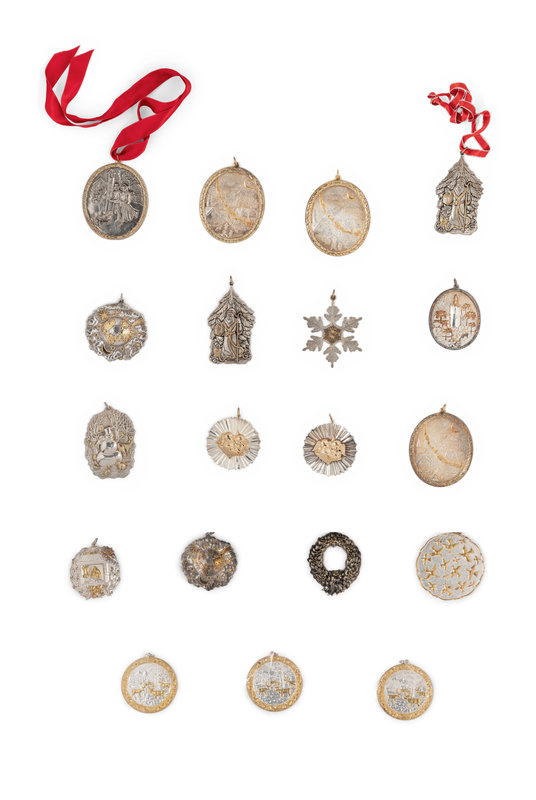 comprising 'Wreath' (no. 618 of 750, 1991), two 'Cherubs' examples (nos. 158 and 418 of 500, 1992), 'Candle and Gifts' (no. 484 of 500, 1993), 'Fireplace' (no. 315 of 500, 1994), 'Snowflake' (no. 346 of 500, 1995), 'Bell' (no. 445 of 500, 1996), 'Snowman' (no. 078 of 500, 1997), two 'Santa Claus' examples (nos. 140 and 476 of 500, 1998), three 'Bell' examples (nos. 151, 179 and 437 of 500, 1999), two 'Children Around the World' examples (nos. 043 and 100 of 500, 2000), three 'Village Scene and Sleigh' examples (nos. 047, 050 and 075 of 500, 2001), 'Doves' (no. 218 of 500, 2003), three 'Reindeer' examples (nos. 153, 174 and 229 of 500, 2005) and 'Victorian Skaters' (no. 200 of 350, 2008).