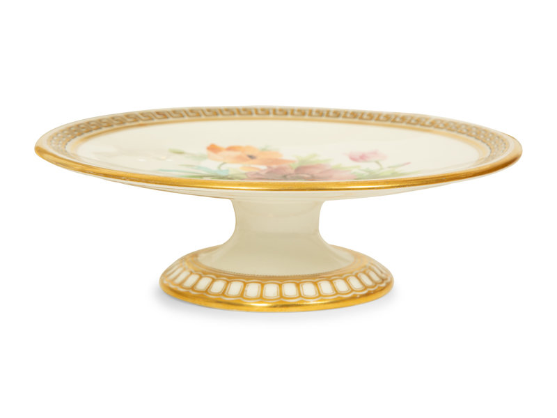 with hand-painted floral center decoration within a black and gilt Greek key border, comprising 16 dessert plates, 4 tall pedestal plates and 4 shorter pedestal plates; 27 items total.