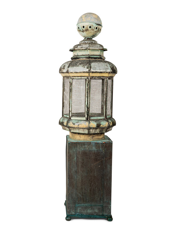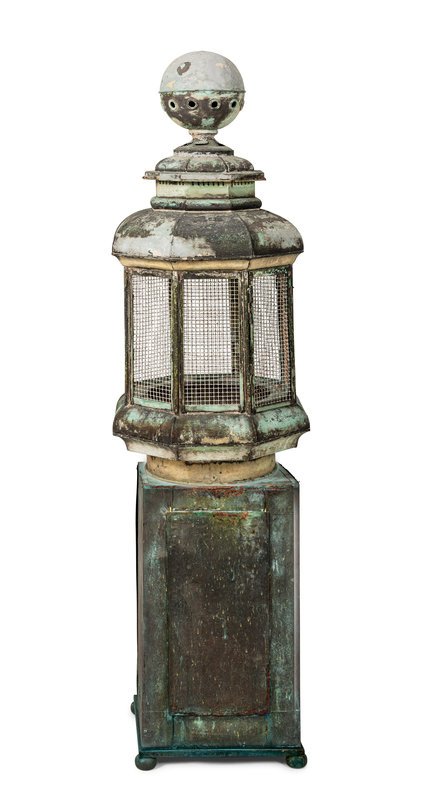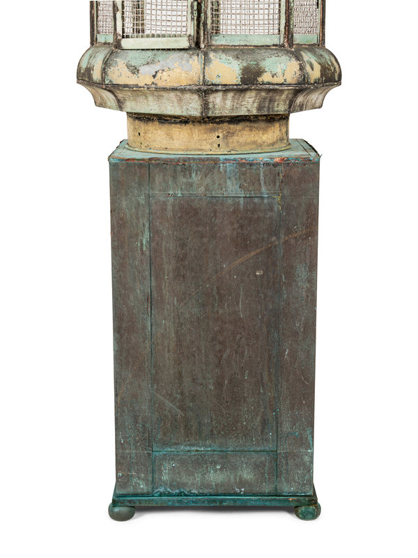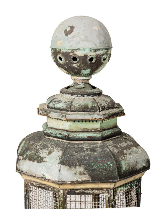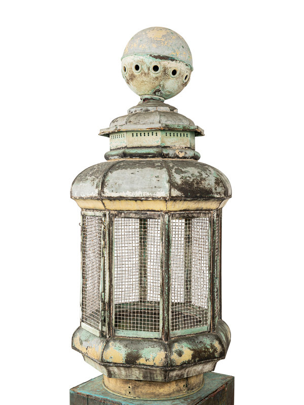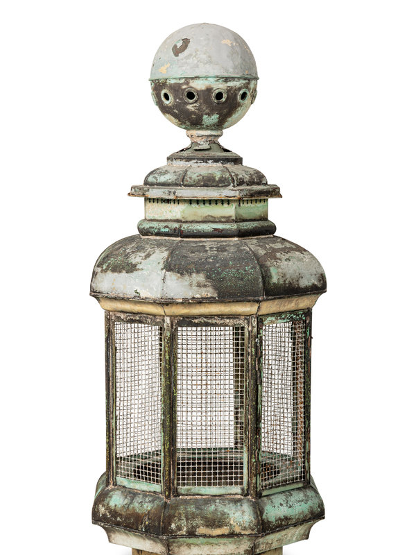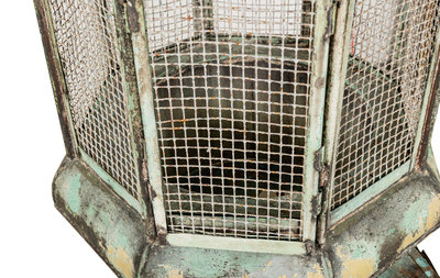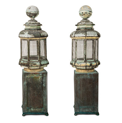 A Pair of Weathered Painted Sheet Metal Lanterns Converted to Bird Cages