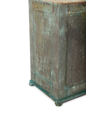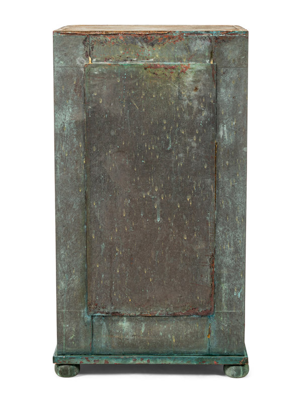 raised on later sheet metal-clad patinated pedestals, weathered to match; one pedestal with three of its feet detached and needing repair but present.