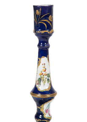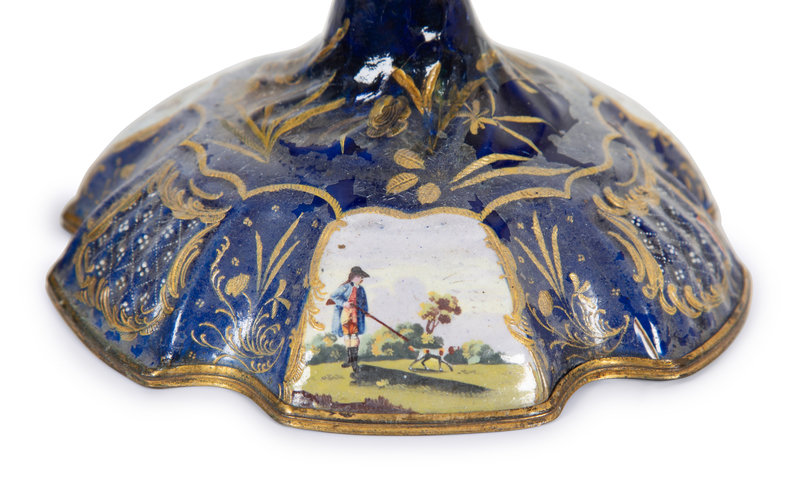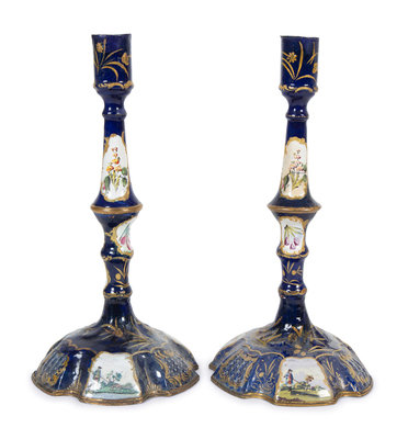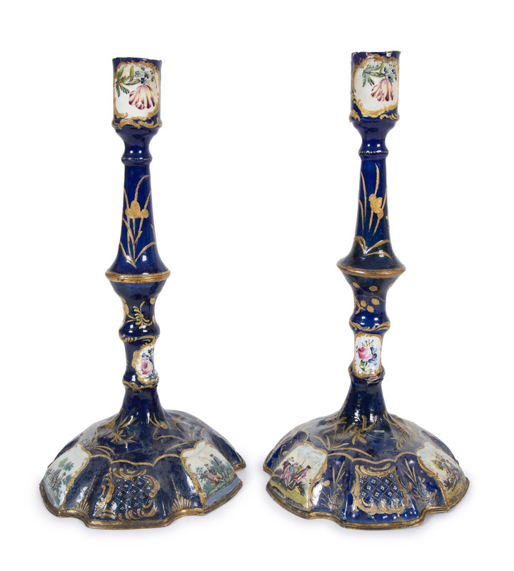 A Pair of Battersea Enamel Candlesticks