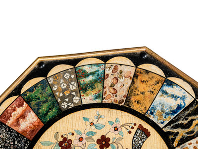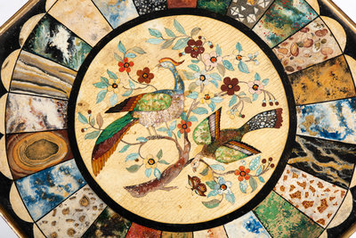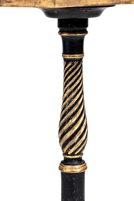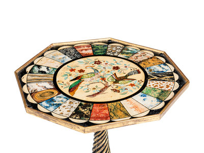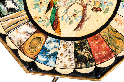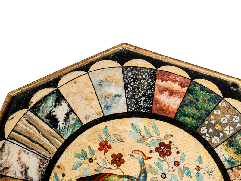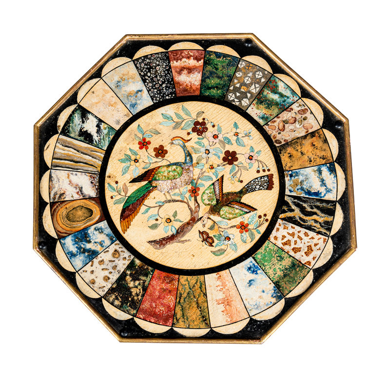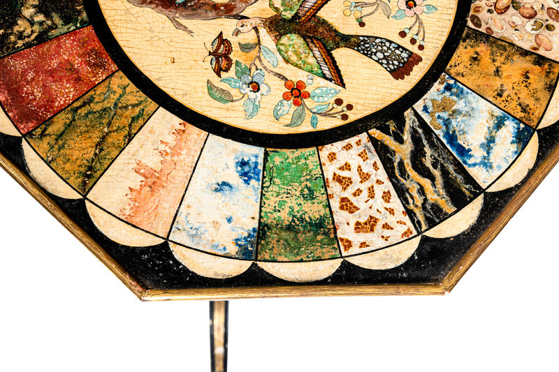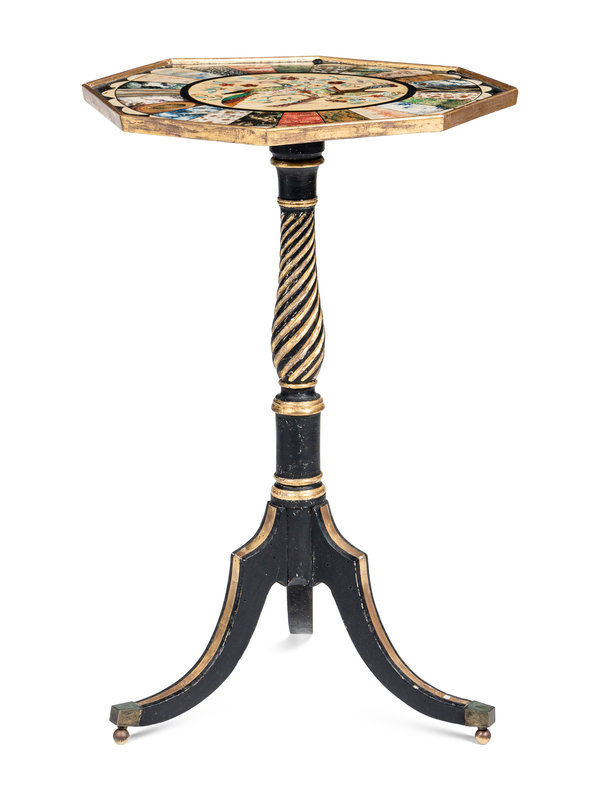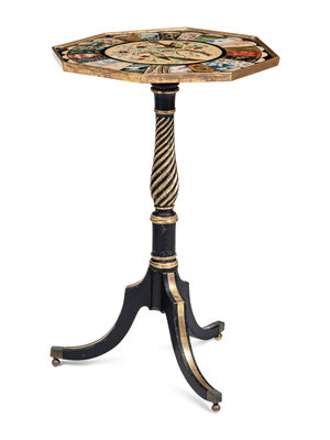 the top and base associated and possibly adapted from a pole screen, the top painted to simulate specimen marble and pietra dura.