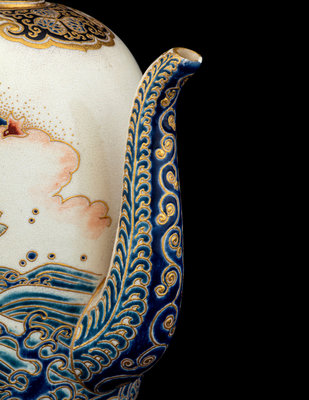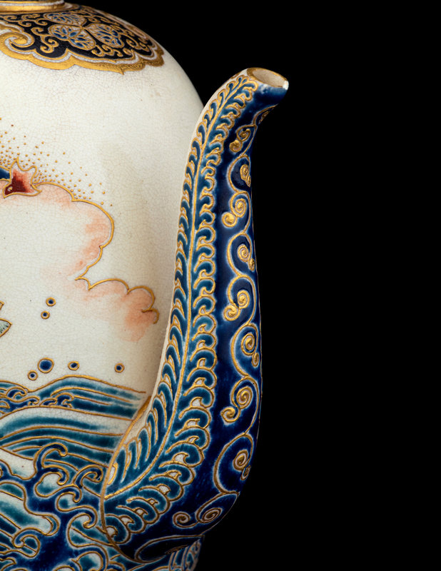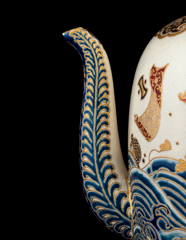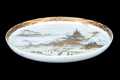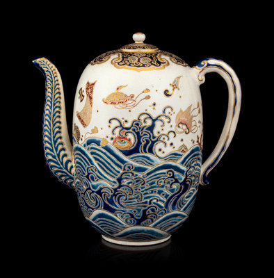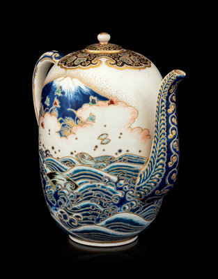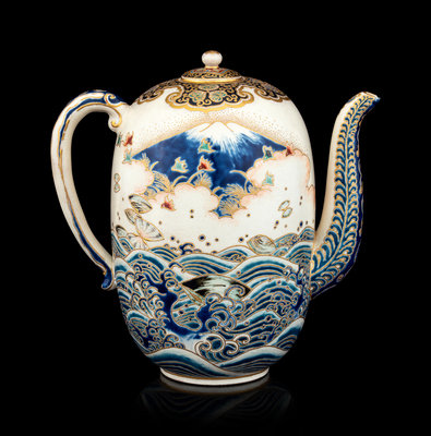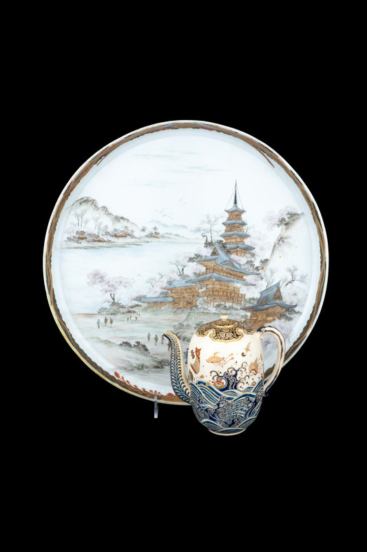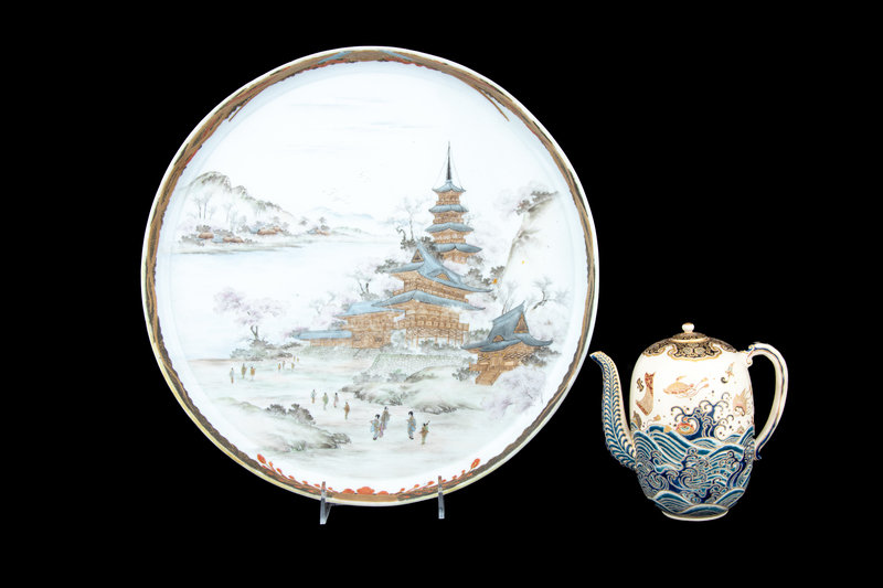 the first a ovoid form teapot, the exterior decorated with Mount Fuji above rushing waves, the mouth rim and the cover enameled with gilt highlights showing foliate scrolls against a black ground, the underside bearing a five-character mark in gilt; the second a large plate with the interior showing a riverscape scene with pagodas, the underside bearing a seven-character marker's mark.
