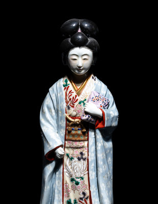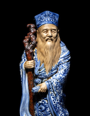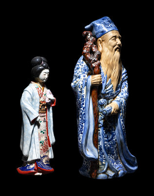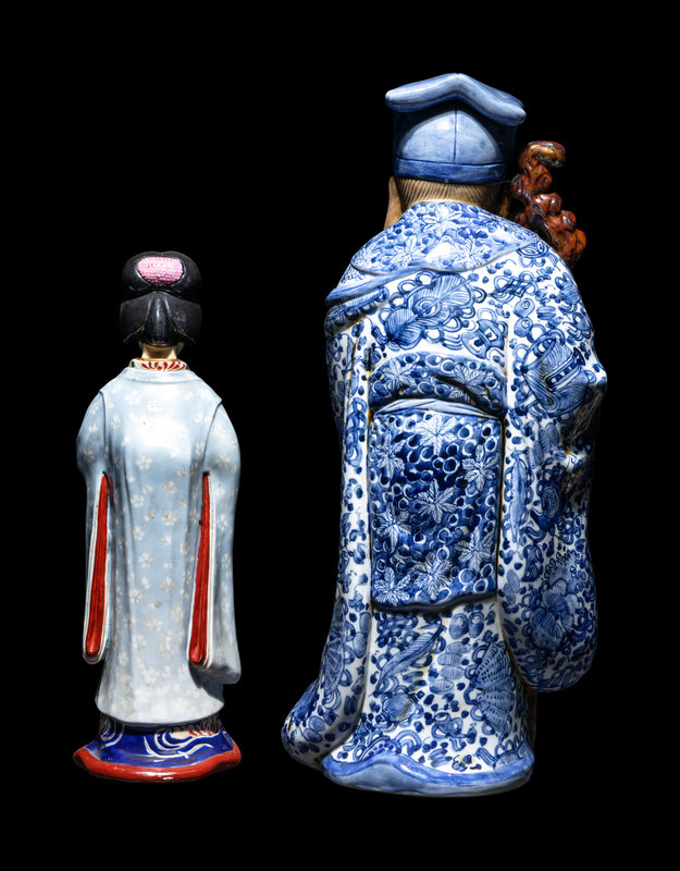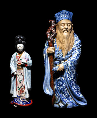 the first a polychrome enameled figure of a geisha, the second a blue and white figure of a Daoist immortal, bearing a staff.
