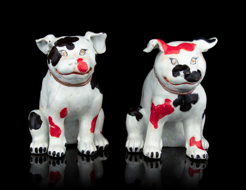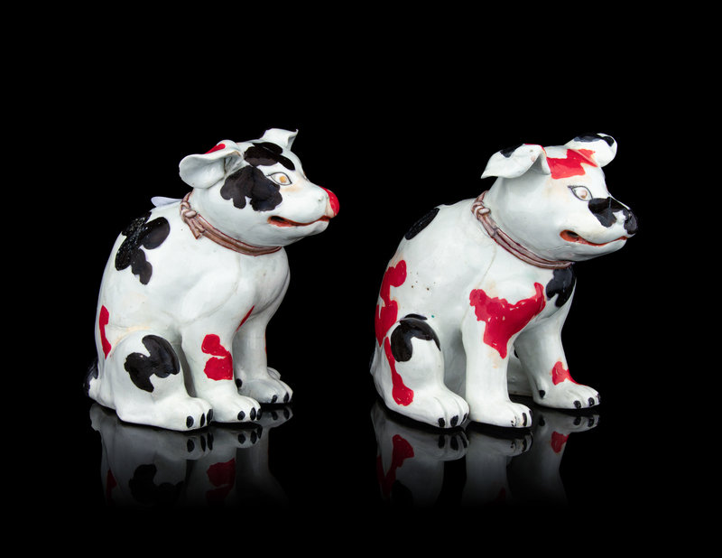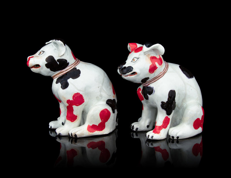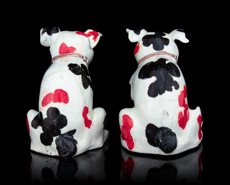 each animal figure seated, facing forward with with alterted ears, the body painted with red and black patches.