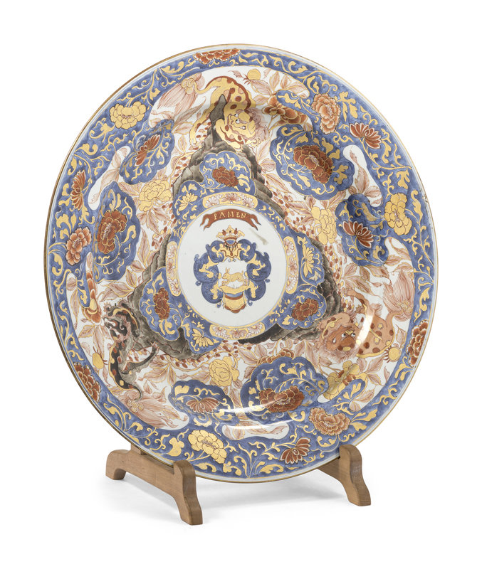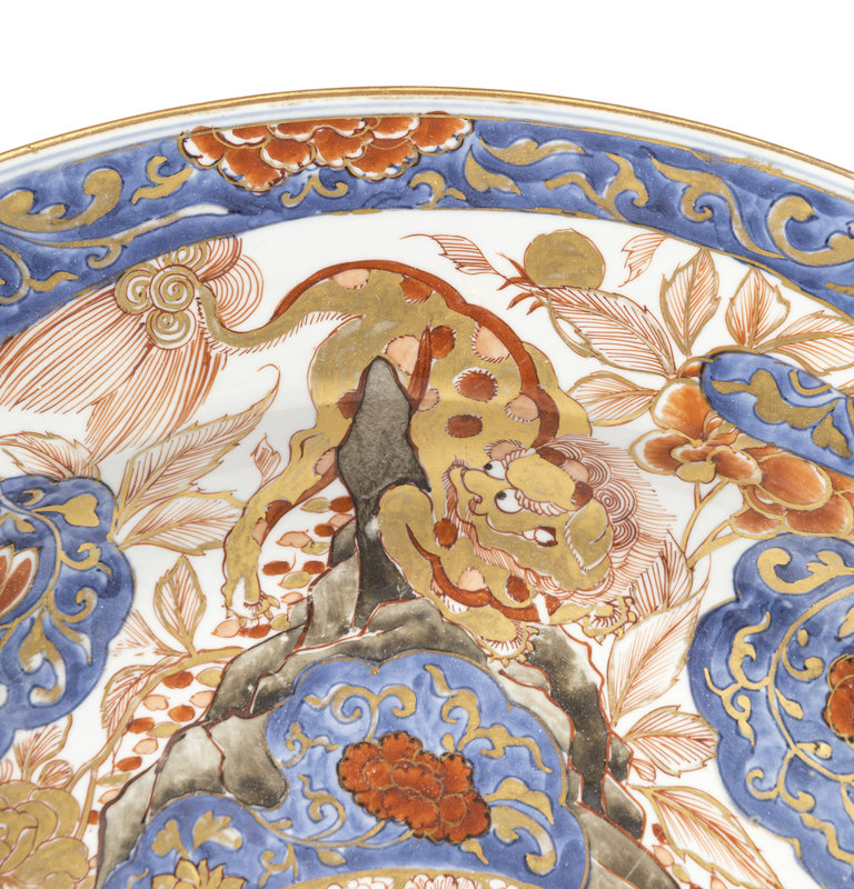decorated in iron-red enamels and gilt on underglaze blue, the interior centered with a coat-of-arm enclosed by peony scrolls and three shishi lions atop rockworks, the wide rim with further blossoming peonies.