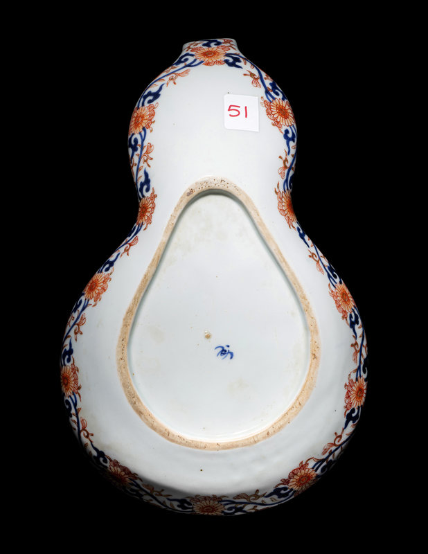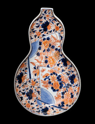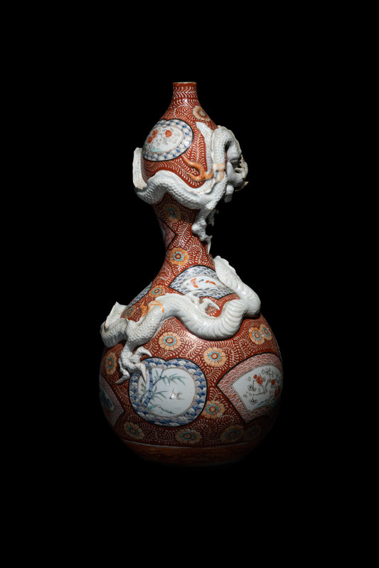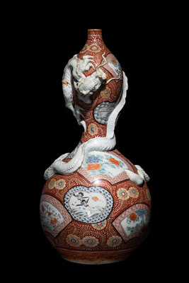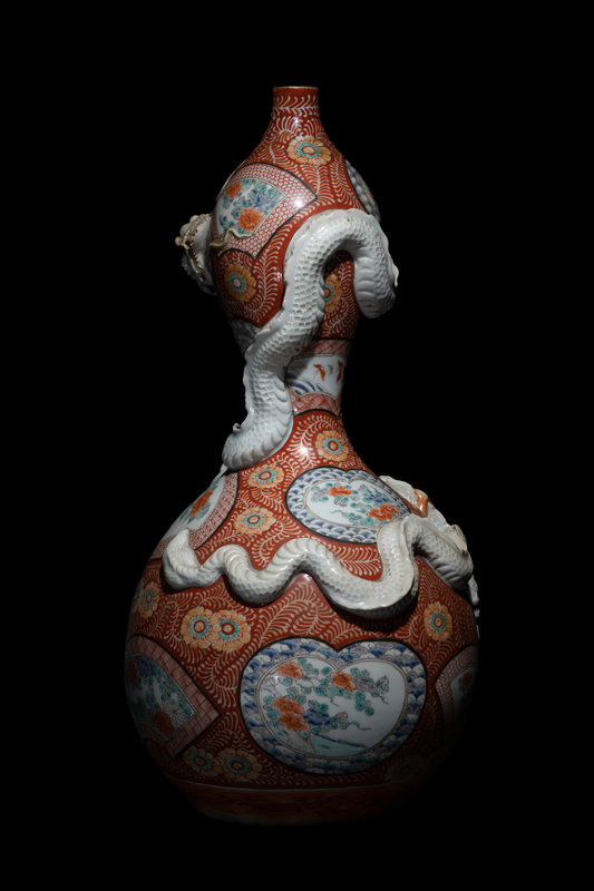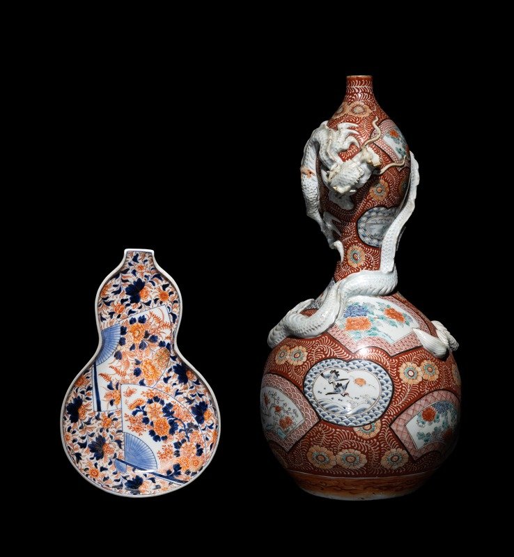 comprising an imari gourd-form plate with floral motifs, and a large kutani gourd-form vase decorated with shaped panels and applied with a white glazed sinuous dragon.