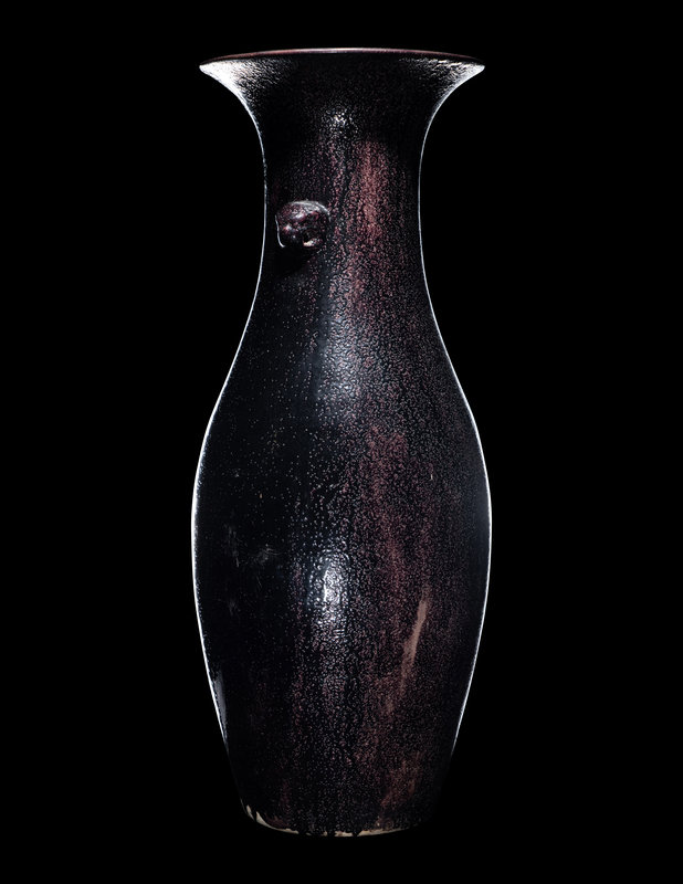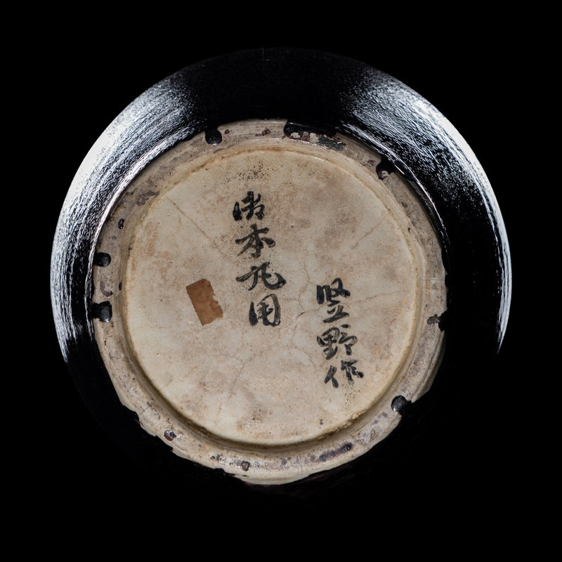 the first a satsuma aubergine glazed example made for use at chief castle of Lord Shimadzu, the pear-shaped body rising to a flaring mouth rim, the recessed neck applied with a pair of mask-form handles, the underside bearing a seven-character mark reading Made by Tateno for use at head castle; the second a blue and white example decorated with floral blossoms.