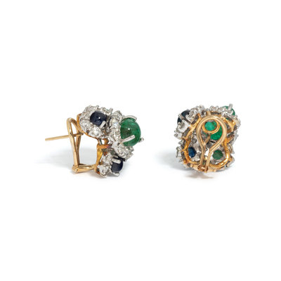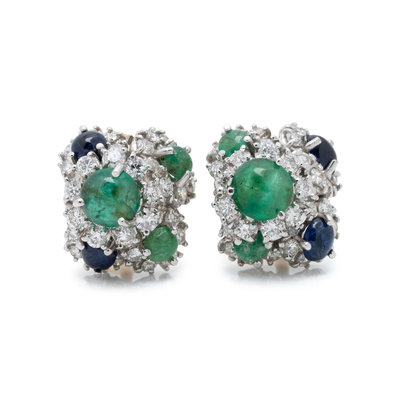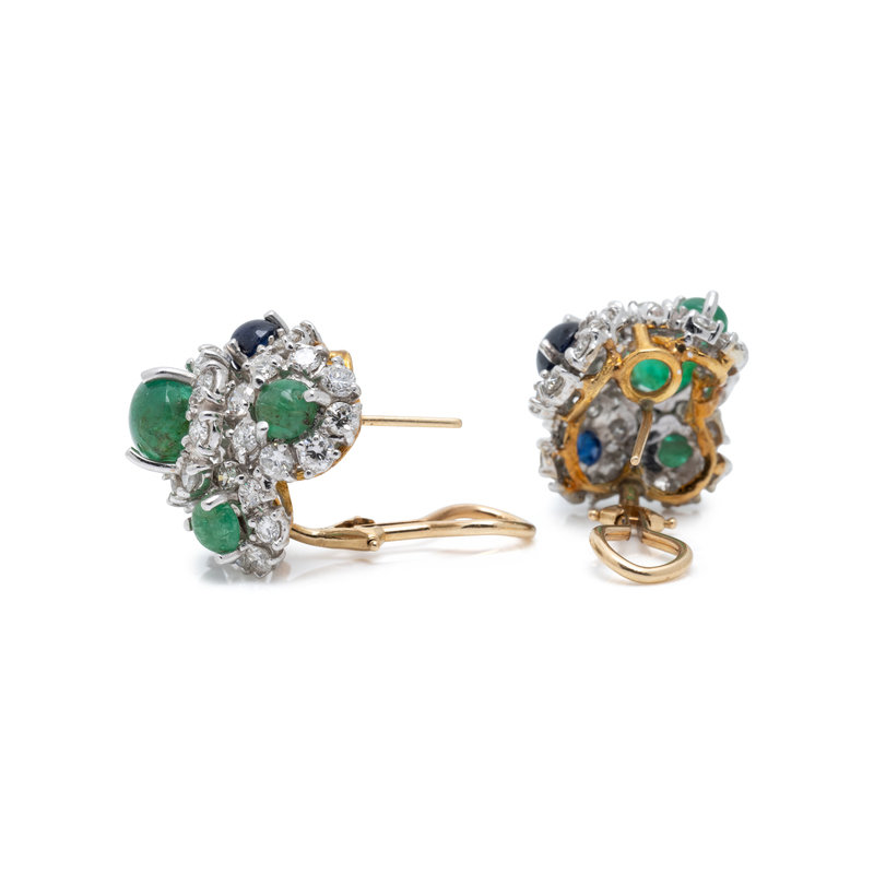 Containing six cabochon emeralds, four cabochon sapphires, and 66 round brilliant cut diamonds weighing approximately 4.00-5.00 carats total, posts with clip backs. Mounted in bicolor gold. 3/4 inch long.