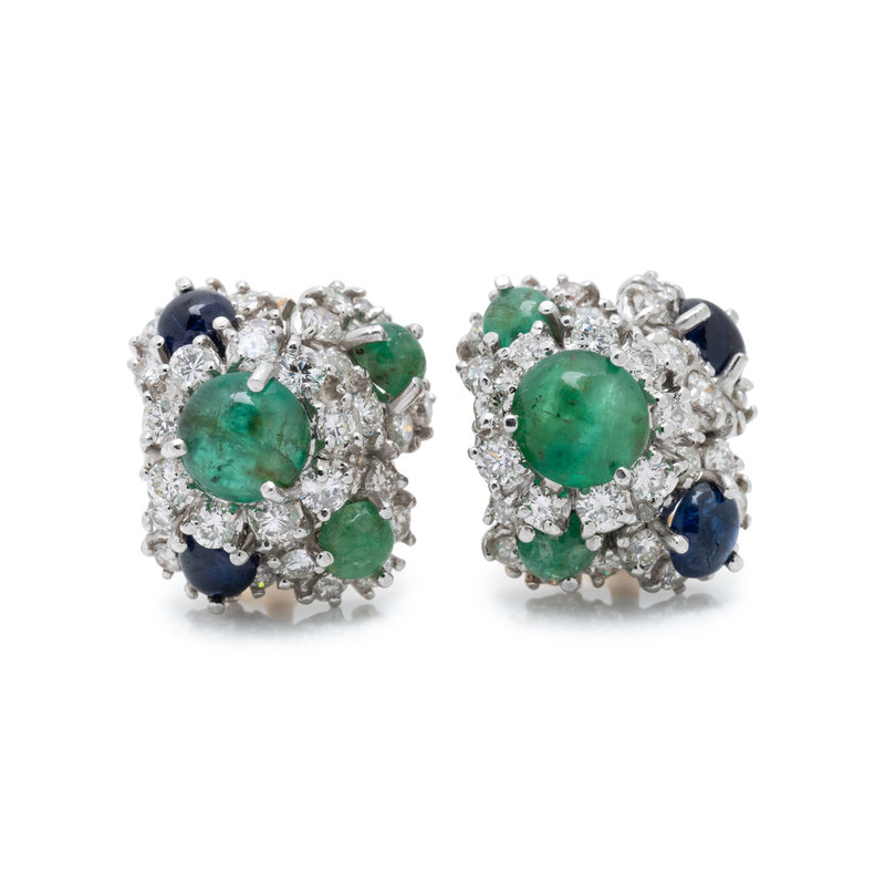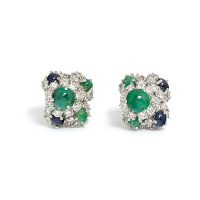 EMERALD, SAPPHIRE AND DIAMOND EARCLIPS