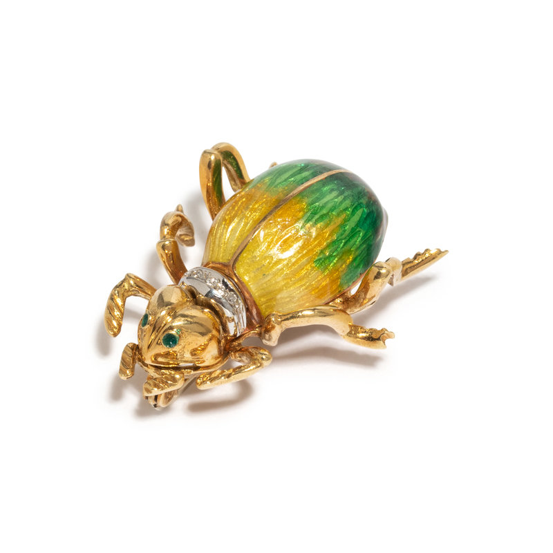 Consisting of a beetle with polychrome enamel body, containing three single cut diamonds. 1 inch x 1 1/4 inches.
