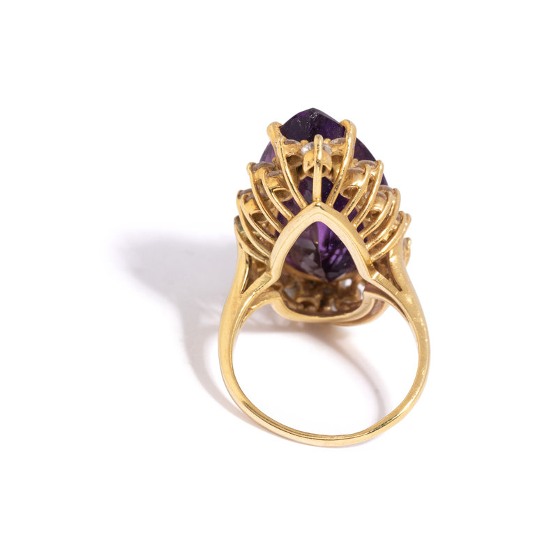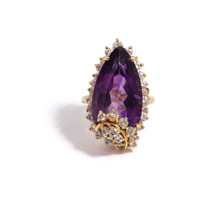 Containing one pear shaped amethyst measuring approximately 23.80 x 13.00 x 10.20 mm and 36 round brilliant cut diamonds weighing approximately 1.65 carats total. Mounted in yellow gold. Ring size 6 3/4.