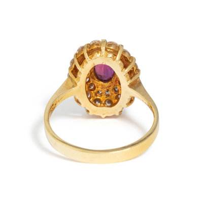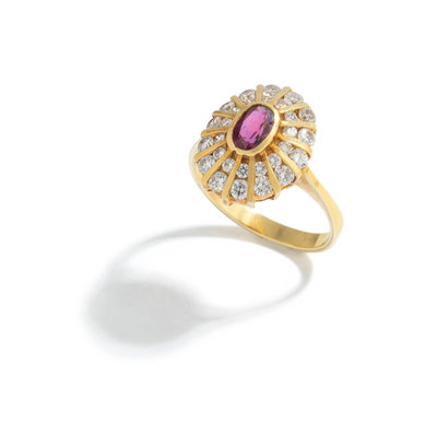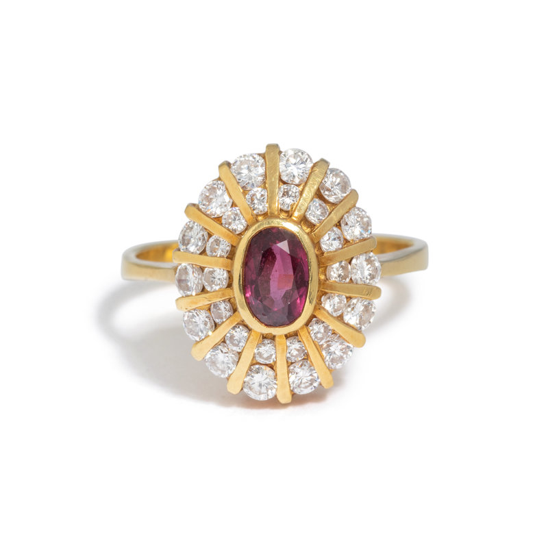 Containing one oval mixed cut ruby measuring approximately 7.00 x 4.45 mm and 28 round brilliant cut diamonds weighing approximately 0.75 carat total. Mounted in yellow gold. Ring size 8 1/4.