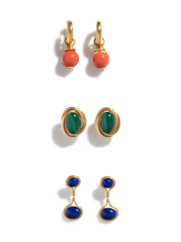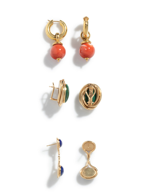 Consisting of a pair of earrings containing two oval cabochon malachites, a pair of earrings containing four oval cabochon lapis lazuli, together with a pair of hoops with removable coral drops. Mounted in yellow gold. Malachite earrings: 1 inch long. Lapis lazuli earrings: 1 1/2 inches long. Coral earrings: 1 3/4 inches long.