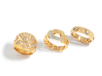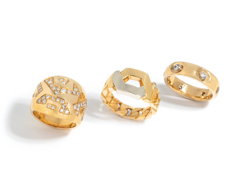 Consisting of a yellow gold and platinum curb link chain ring, a band containing six round brilliant cut diamonds, and a ring containing 53 round brilliant cut diamonds weighing approximately 0.80 carat total. Ring size 6, 7 1/4 and 5 1/4.