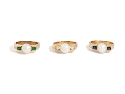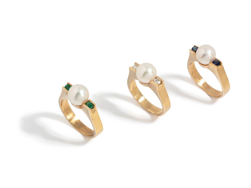 Consisting of three rings each containing one pearl measuring approximately 7.60 mm in diameter, two round mixed cut emeralds, two round mixed cut sapphires and two round brilliant cut diamonds. Ring size 6 1/2, 6 1/2 and 5 3/4.