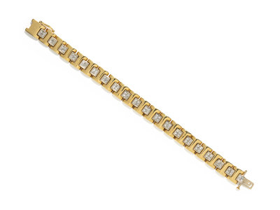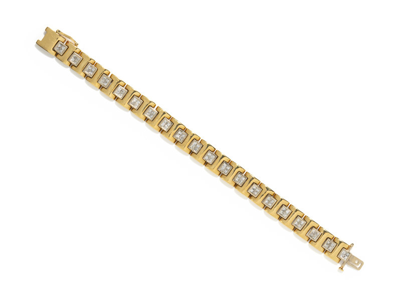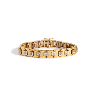 Consisting of links measuring approximately 10.00 mm wide interspersed with square links containing 80 princess cut diamonds weighing approximately 4.00 carats total. 6 7/8 inches long.
