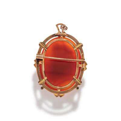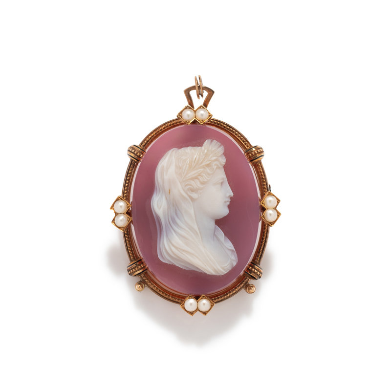 ROSE GOLD, PEARL AND ENAMEL CAMEO PENDANT/BROOCH