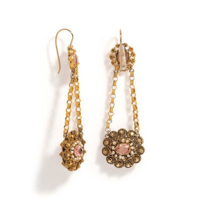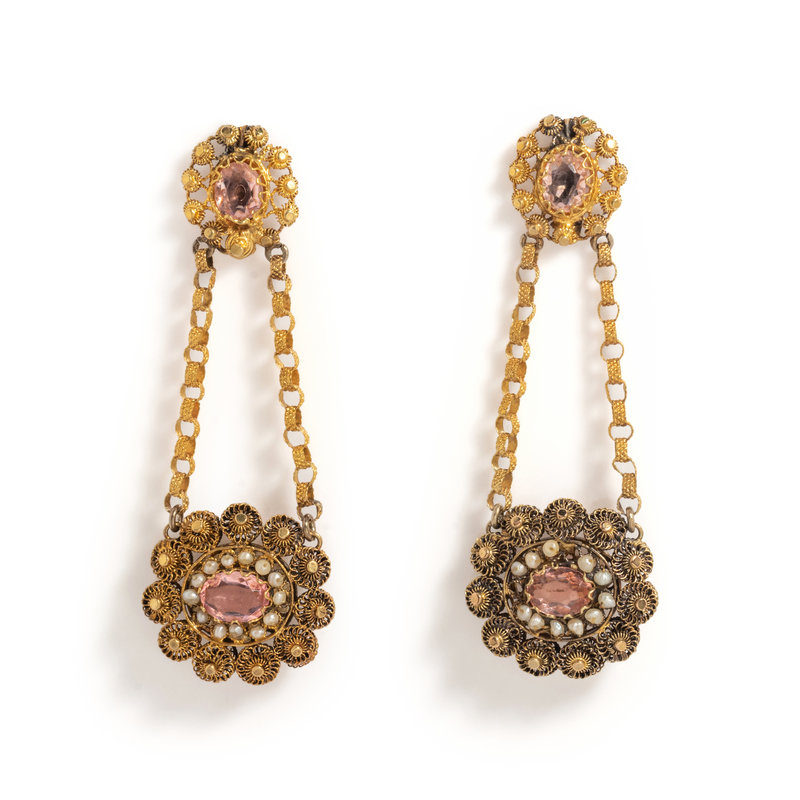GEORGIAN, YELLOW GOLD, TOPAZ AND SEED PEARL EARRINGS