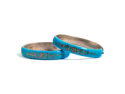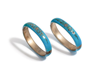 Consisting of two bangles in blue enamel with engraved floral design containing numerous seed pearls (origin not tested). Mounted in silver. 6 1/4 inches inner circumference.