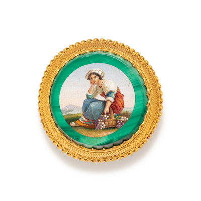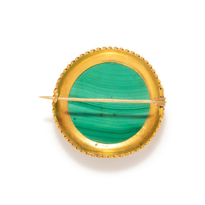Depicting a seated woman in a malachite and detailed gold surround. Mounted in yellow gold. 1 5/8 inches in diameter.