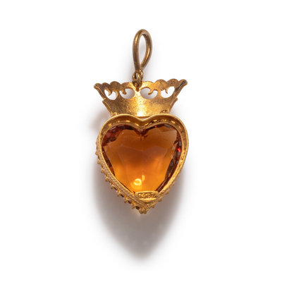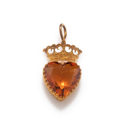 Consisting of an engraved crown atop a heart shaped citrine measuring approximately 15.00 x 15.00 mm. 1 inch long.