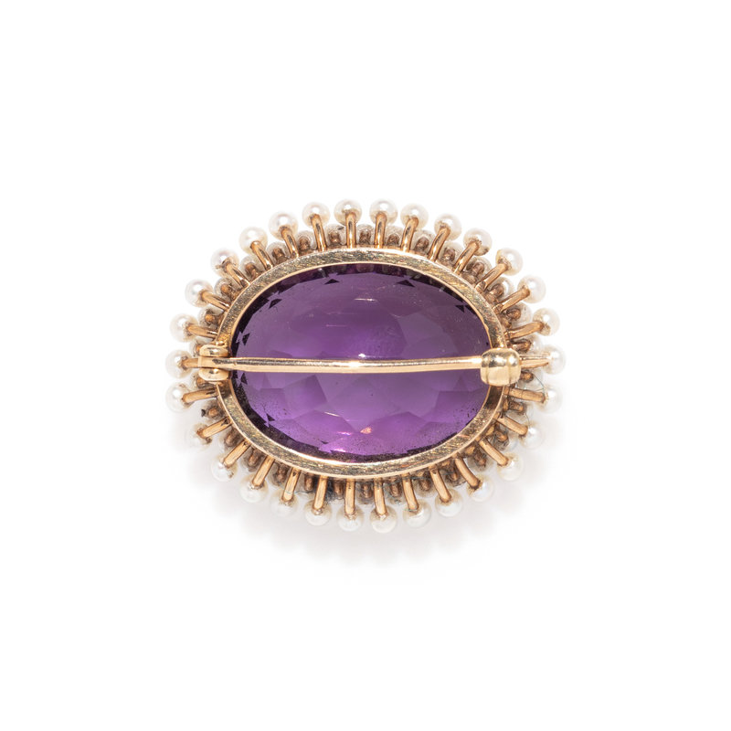 Containing one oval mixed cut amethyst measuring approximately 22.40 x 17.00 x 10.90 mm and 60 seed pearls measuring approximately 2.10 mm in diameter. Mounted in yellow gold. 1 inch x 1 1/4 inches.