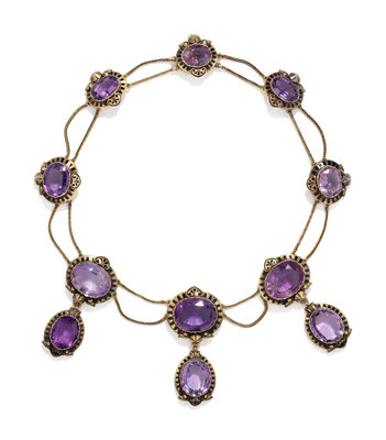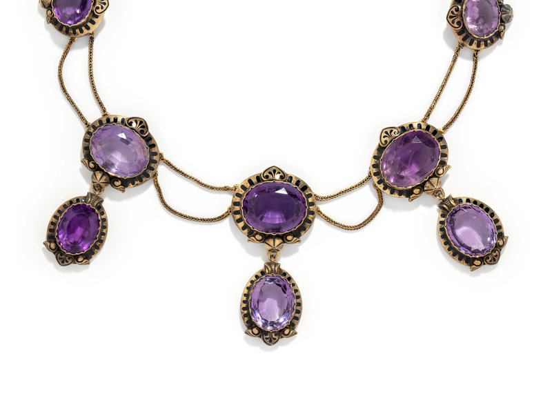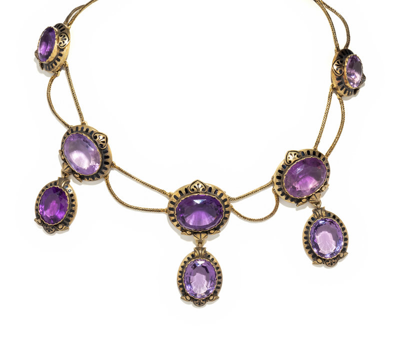 Consisting of a swag design with three drops, containing 11 oval mixed cut amethysts measuring approximately 15.00 x 12.00 mm to 22.00 x 18.00 mm and black enamel detail. 16 1/2 inches long.