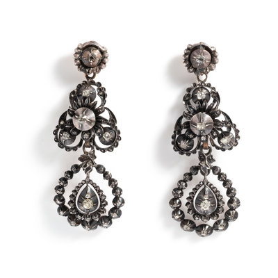 Containing numerous rose and old mine cut diamonds with removable drops. Mounted in blackened silver and yellow gold. 2 1/2 inches long.
