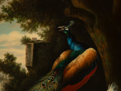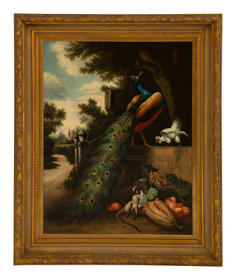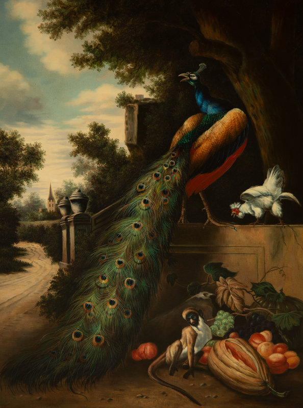 Classical Scene with Peacock, Monkey and Chicken