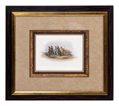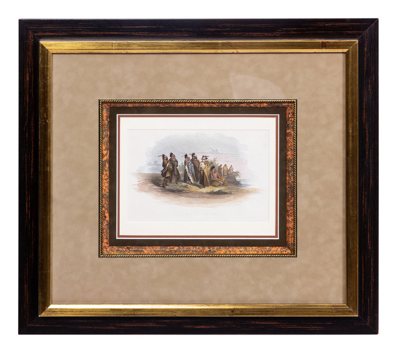 Engraving with hand-coloring, ca 19th-century, 5 1/2 x 9-inches, matted and framed (unexamined out of frame).