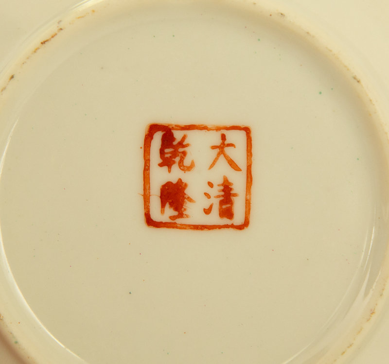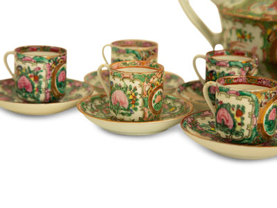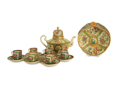 comprising a shell form dish, a teapot, and a set of six demitasse cups and saucers; 8 items total.