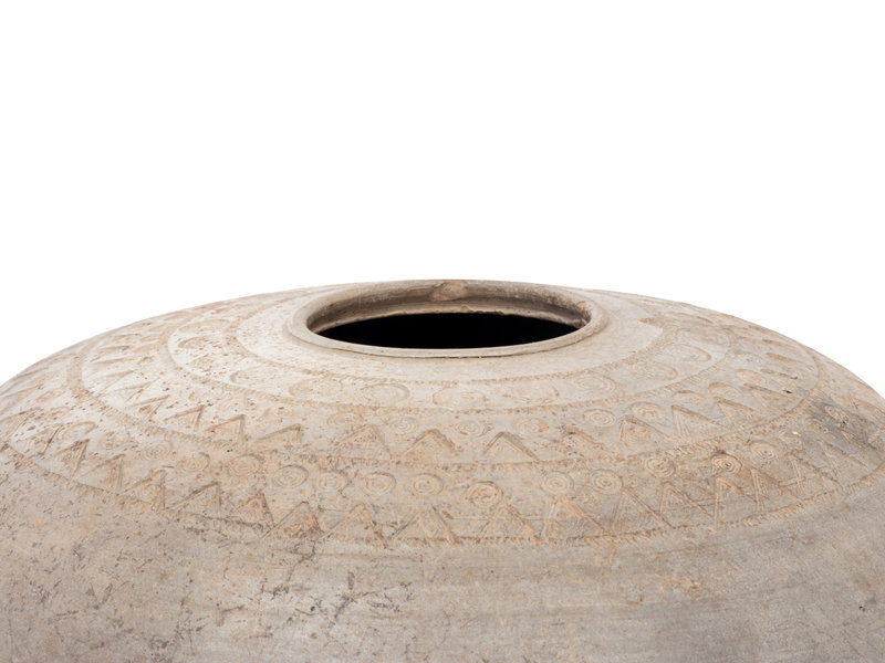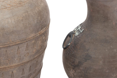 the granary vessel is decorated with three large bands enclosing a pattern of impressed circles and stylized, pointed leaves, on three stylized feet molded as animals, the second a pear-shaped vase made after a bronze example, surmounted by a tall waisted neck and supported on a slightly spreading foot, with taotie mask and ring handles.