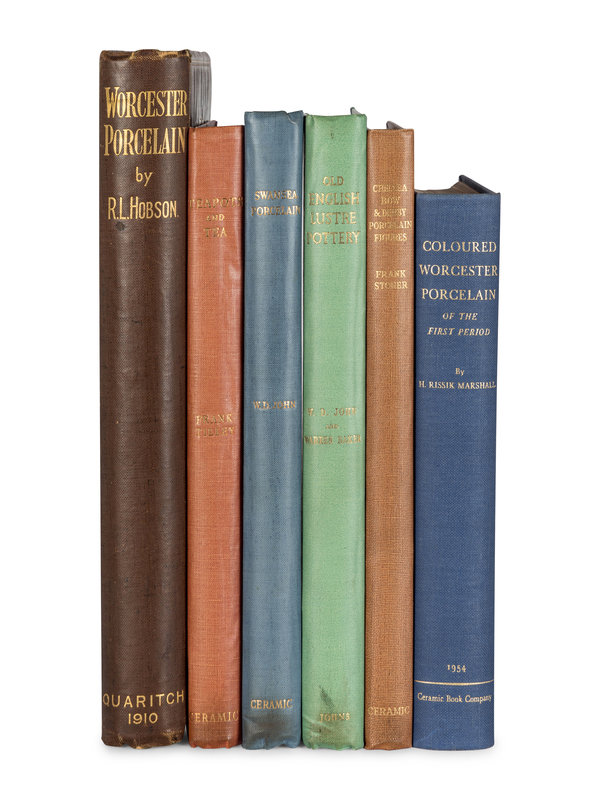 HOBSON, R.L. Worcester Porcelain a Description of the Ware from the Wall Period to the Present Day. Bernard Quaritch, 1910. -- MARSHALL, H. Rissik. Coloured Worcester Porcelain of the First Period (1751-1783). Ceramic Book Company, 1954. LIMITED EDITION, unnumbered one of 1,200 copies. -- EARLE, Major Cyril. The Earle Collection of Early Staffordshire Pottery. A. Brown and Sons, Limited, n.d. -- TILLEY, Frank. Teapots and Tea. The Ceramic Book Company, [1957]. LIMITED EDITION, unnumbered one of 1,000 copies. -- JOHN, W.D. Swansea Porcelain. The Ceramic Book Company, [1958]. -- STONER, Frank. Chelsea Bow and Derby Porcelain Figures Their Distinguishing Characteristics. The Ceramic Book Company, [1955]. -- JOHN, W.D. et al. Old English Lustre Pottery. R.H. Johns Ltd., [1951]. -- And 8 others. Together, 15 works in 16 volumes, most published in London or Newport, [Monmouthshire], various sizes, most illustrated, all in original bindings, many FIRST EDITION, condition generally good. Complete list available upon request.