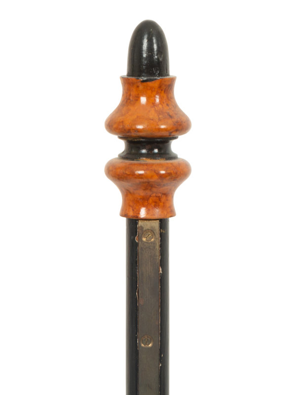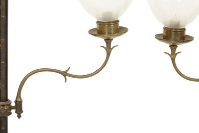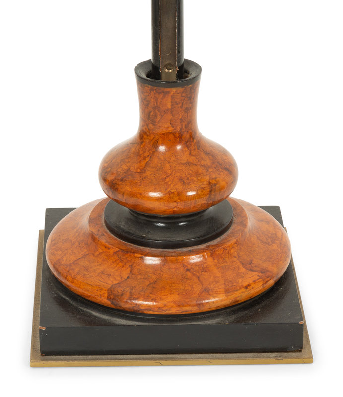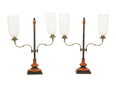 A Pair of Treen and Steel Hurricane Lamps with Etched Glass Shades