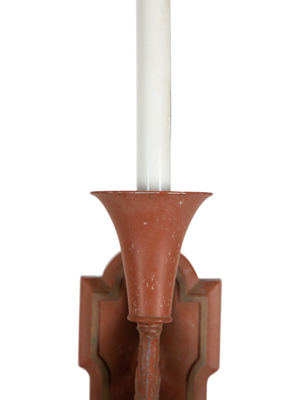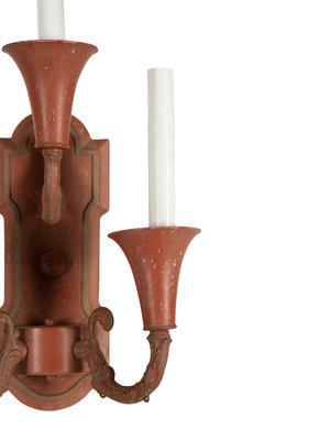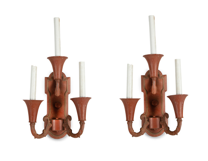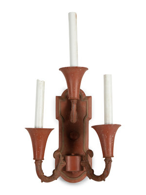 A Pair of Red and Gilt Decorated Tole Three-Light Wall Sconces
