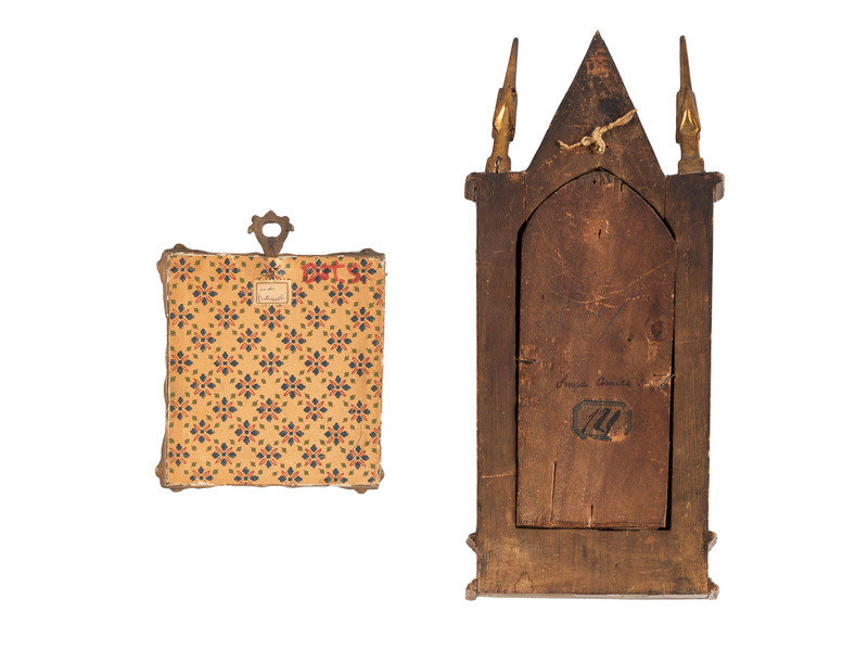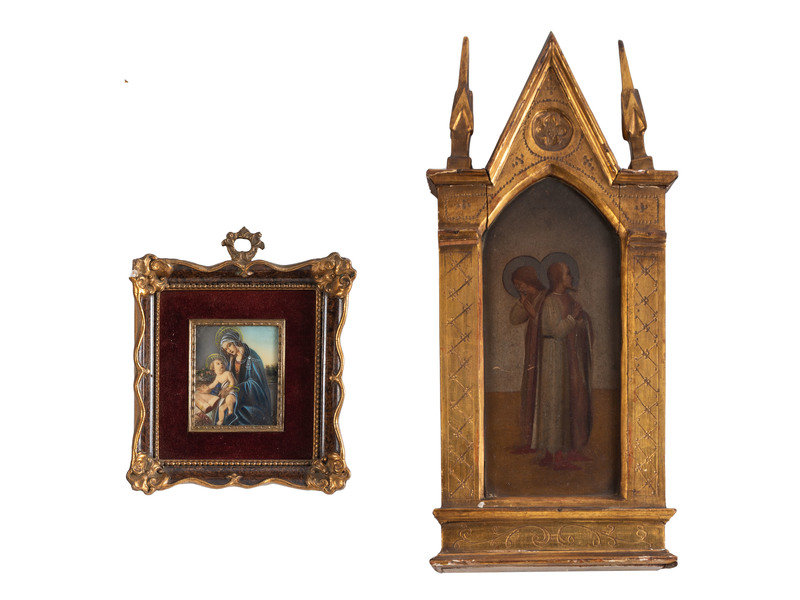 comrpising a panel painting of two saints housed in a Gothic-style giltwood frame and miniature souvenir painitng of Madonna del Libro after Sandro Botticelli (Italian, 1445-1510).